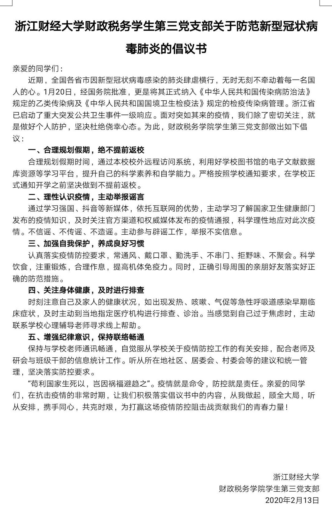 与此同时,支部党员共同书写倡议书,向全体学生发出五大倡议:一、合理规划假期,绝不提前返校;二、理性认识疫情,主动举报谣言;三、加强自我保护,养成良好习惯;四、关注身体健康,及时进行排查;五、增强纪律意识,保持联络畅通。在防控疫情的关键时刻,支部24名党员带头承诺,坚决顾全大局,服从属地政府、学校的统一安排,诠释着党员先锋“疫”战到底的决心。