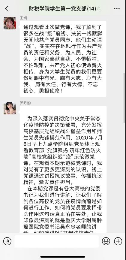 支部成员在观看微党课后深为所动,展开了热烈的讨论,表达自身的感想。郭丹韵同志说:“这次微党课让我印象最深刻的就是重庆大学附属肿瘤医院各科党委书记、青年党员以身作则,冲锋在前的英勇事迹,在疫情最严重的时候,各支医疗团队将人民放在第一位,真正做到了守土有责、守土担责、守土尽责......我深刻认识到作为一名学生党员肩上应承担的责任,我们应该让青春在砥砺中前行,同时作为党员的预备军,我们更应该起到先锋模范作用,传承红色基因,颂扬奉献精神,为国家建设出一份力。”