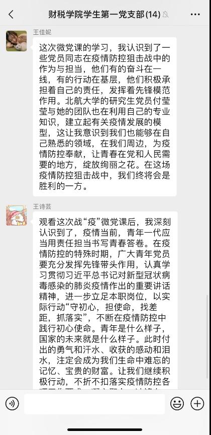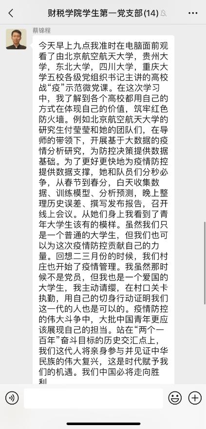 蔡锦程同志分享道:“在这次学习中,我了解到各个高校都用自己的方式在体现自己的价值,筑牢红色防火墙。例如北京航空航天大学的研究生付莹莹和她的团队们,在导师的带领下,开展基于大数据的疫情分析研究,为防控决策提供数据基础。为了更好更快地为疫情防控提供数据支撑,她和队员们分秒必争,从春节到春分,白天收集数据、训练模型、分析预测,晚上整理历史误差、撰写发布报告,召开线上会议。从她们身上我看到了青年大学生该有的模样。虽然我们只是一个普通的大学生,但我们也可以为这次疫情防控贡献自己的力量。回想二三月份的时候,我们村庄也开始了疫情管理。我虽然那时候不是党员,但我也是一个爱国的大学生,我主动请缨,在村口关卡执勤,用自己的切身行动证明我们新一代青年的力量。疫情防控的伟大斗争中,大批中国青年更应该展现自己的担当。”