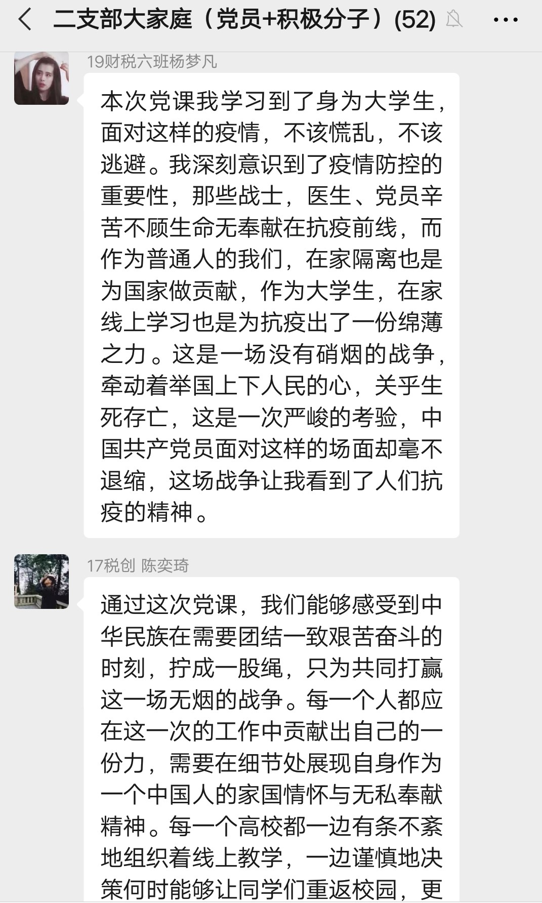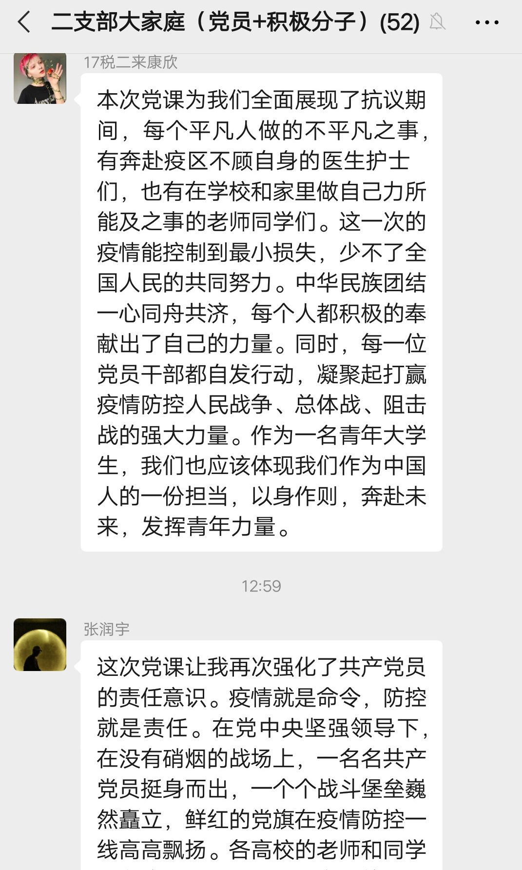 徐浩凯同学说:“学习了这期微党课以后,让我了解和认识到党员们在重大事件中的责任和担当。青年教师中即使有身患疾病的成员,也毫不犹豫且坚决地要加入到党的工作小组,不顾己身病情的恶化。而作为高校中的一名大学生,也能在抗疫过程中捐献自己所能,做出了不小的贡献,是值得我们众青年学习的。无论发生什么事件,党组织党员们的家国情怀、舍小为大、不畏艰险、直面向前的精神,在我们的心中筑起一道红色的高墙。”