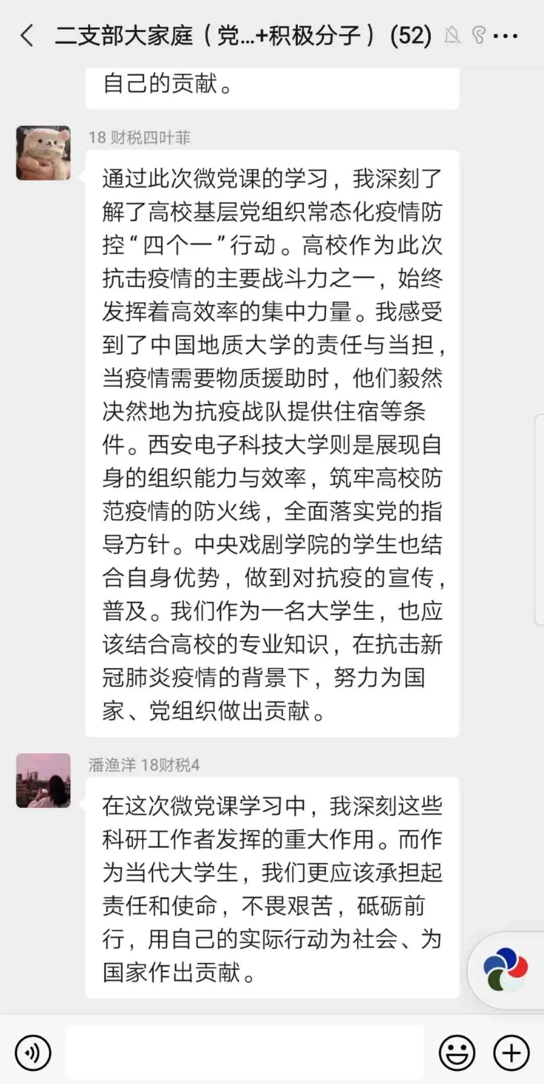 学生第二党支部组织观看学习高校党组织战“疫”示范微党课。本次微党课由上海交通大学林忠钦院士、北京理工大学张军院士、中国农业大学康绍忠院士、南京航空航天大学冯邵红党委书记等联合开讲。他们结合高校翔实生动的校史、校情向大家生动诠释了高校的发展始终与国家、民族命运紧密相连的奋斗历程,强调了坚持正确导向,强化典礼育人在新时代大学生中弘扬爱国主义精神的重要意义。