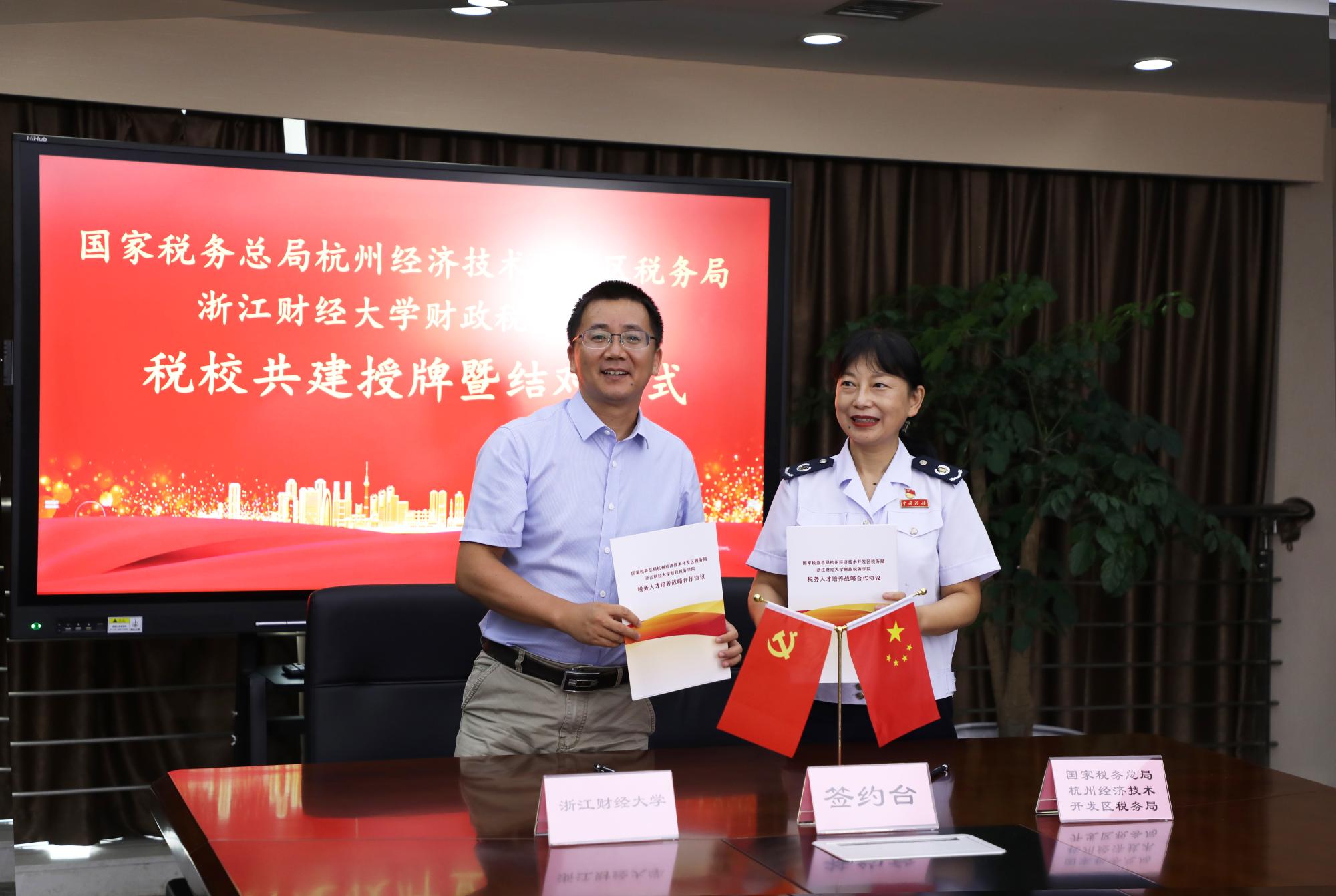 与杭州经济技术开发区税务局举行税校共建授牌暨结对仪式。校党委副书记黄建新,杭州市税务局党委委员、总经济师沈燕,杭州市税务局系统党建工作处(党委宣传处)处长汪成红,钱塘新区管委会党群工作部(组织部)副部长、机关党委专职副书记施正森,钱塘新区管委会妇工委副主任徐伟英等出席授牌结对仪式。