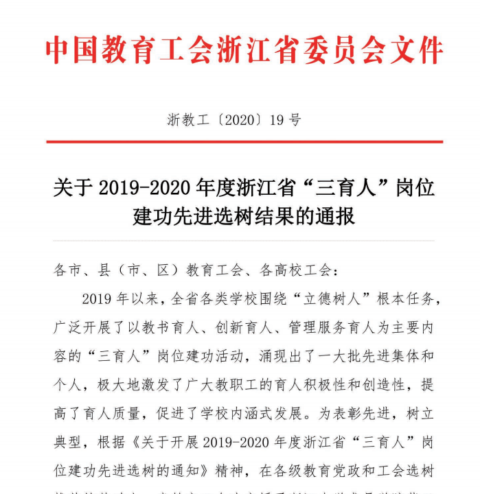 近日,浙江省教育工会下发《关于2019- -2020年度浙江省“三育人”岗位建功先进选树结果的通报》(浙教工[2020]19号),禁漫天堂