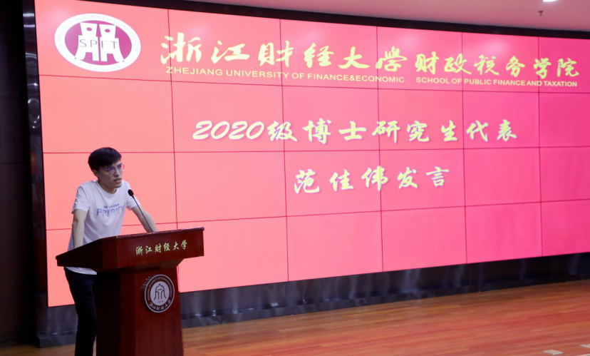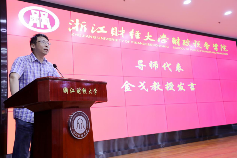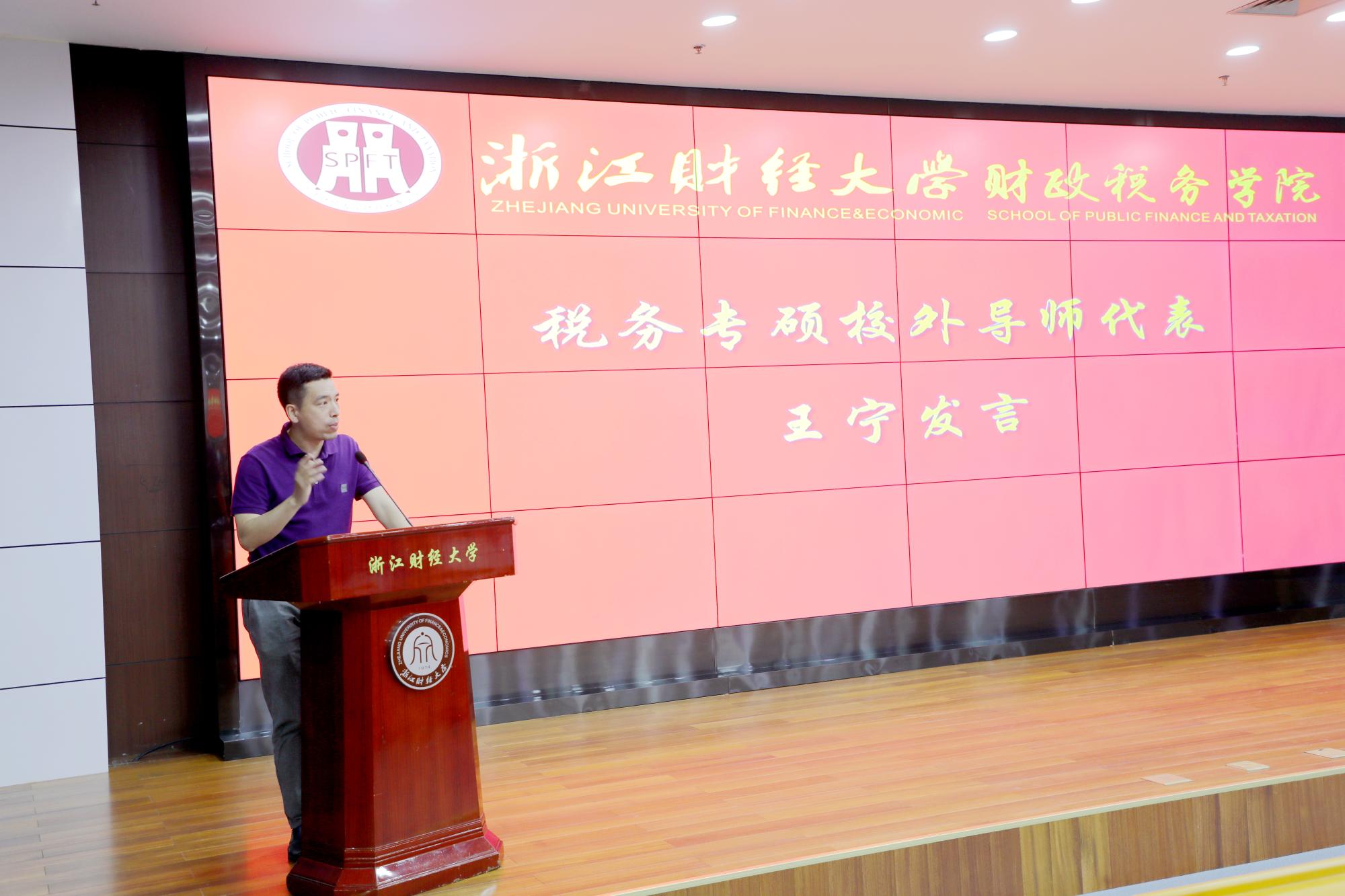 导师代表金戈教授从做人和做学问两个层面分享了他的治学感悟。在做人上,勉励同学们要在急速变化的社会中保持定力,勇于做一个正直的人;在做学问上,鼓励同学们自由探索。税务专硕校外导师代表、杭州中税税务师事务所有限公司总经理王宁,以导师和学长的双重身份,结合自己职业成长经历及多年的行业经验,向学弟学妹生动阐述了财税类专业的广阔市场前景,同时勉励大家要脚踏实地、不懈专研。