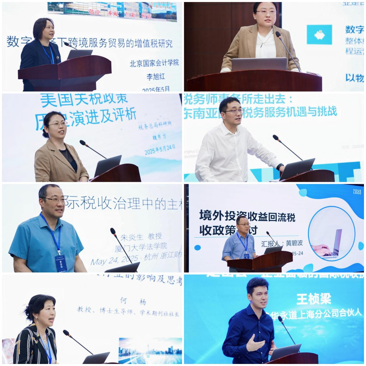 北京国家会计学院党委委员、副院长,院学术委员会主任、教授,博士生导师李旭红作题为《数字经济下跨境服务贸易的增值税研究》的主题发言。她深入探讨了跨境服务贸易增值税管理面临的挑战,提出了完善我国跨境服务贸易增值税管理的建议。国家税务总局国际税务司国际税收协定处副处长张瑾作题为《数字经济时代的国际税收协调》的主题发言。她梳理了G20/OECD包容性框架与联合国近年来进行数字经济国际税收协调的一系列成果,并分析了近期各国的政策变化。她提出,当前国际税收协调有待进一步推进,各国相关税收政策存在不确定性,我国财税部门应继续积极参与多边协调,共同推动形成稳定的国际税收环境与国际税收规则体系,更好服务“走出去”企业。国家税务总局税收科学研究所国际税收研究室主任魏东方作题为《美国关税政策历史演进及评析》的主题发言。她详细阐述了美国关税政策历史演进的几个阶段。她认为,在美国200多年的经济发展史中,关税政策一直扮演着重要角色,对美国乃至世界经济都有着深刻影响。中汇税务事务所总经理、浙江省国际税收研究会副会长方敬春作题为《关于税务师事务所走出去——东南亚国家税务服务研究》的主题发言。他分析了RCEP全面生效及东南亚各国税收优惠政策为跨境税务服务带来机遇,以及国内事务所面临多重挑战,并提出应对策略。厦门大学教授朱炎生作题为《在国际税收治理中主权话语的应用》的主题发言。他提出当前国际税收治理体系面临大国博弈与主权平衡的双重挑战,并指出我国应坚持多边主义,维护自身税收主权等建议。国家税务总局浙江省税务局国际税收管理处处长黄碧波作题为《“走出去”企业境外利润回流税收负担问题研讨》的主题发言。他指出,随着中企境外投资规模扩大,优化跨境税收政策成为促进资本回流的重点,并提出了相关政策完善建议。中央财经大学教授何杨作题为《关税冲击对中国高科技行业的影响及思考》的主题发言。她分析了新一轮加征关税的影响,她建议完善我国支持技术创新的税收政策。普华永道上海分公司合伙人王桢梁作题为《“走出去”企业面临的国际税收挑战与应对》的主题发言。他表示未来十至二十年,对国际税收人才会有一个很大的需求,国际税收专业大有可为。