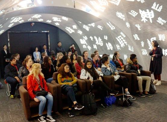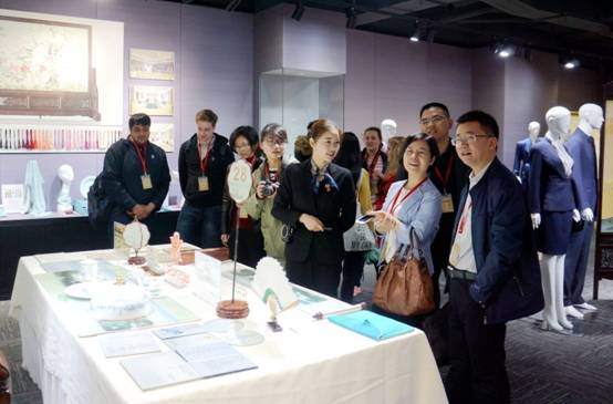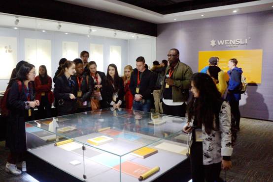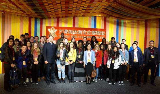 签约仪式结束后,双方代表陪同英国考文垂大学师生交流团一起参观万事利集团丝绸文化博物馆,开启了一场丝绸之旅。通过观看丝绸博物馆短片,大家不仅了解了万事利的文化内涵,更加深了对丝绸发展的认识。在展示北京奥运会,上海世博会,APEC亚太经合组织,G20峰会礼仪人员的服装前,交流团师生们驻足观望,赞叹中国传统服饰的同时,传达出对中华民族传统文化的由衷喜爱。