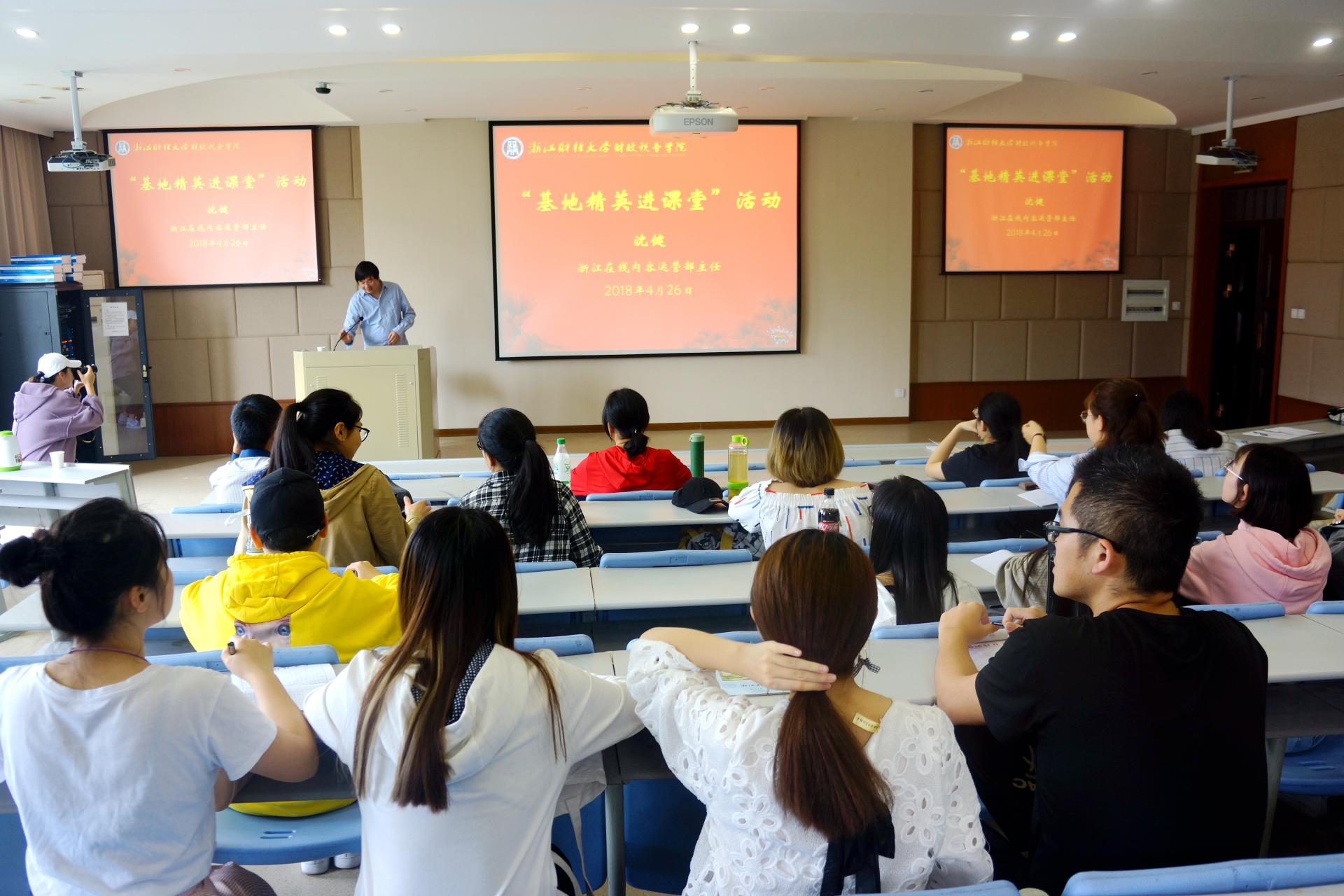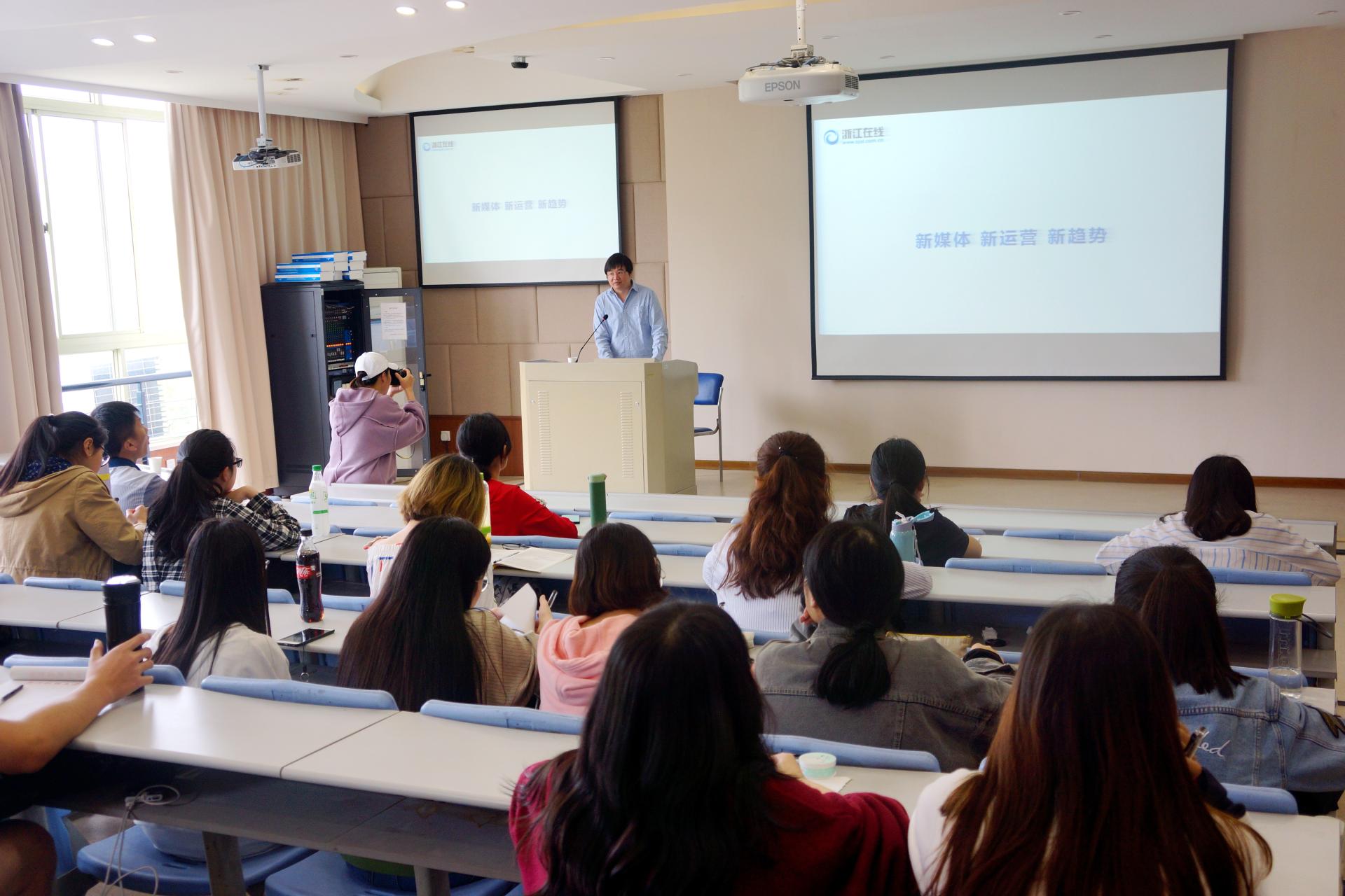 4月26日,浙江在线内容运营部主任沈健在财税学院楼208教室作了题为“新媒体,新运营,新趋势”的报告。本次报告作为财经新闻专业 “基地精英进课堂”活动,由财税学院财经新闻系主任曹爱民主持,财经新闻系学生参加。