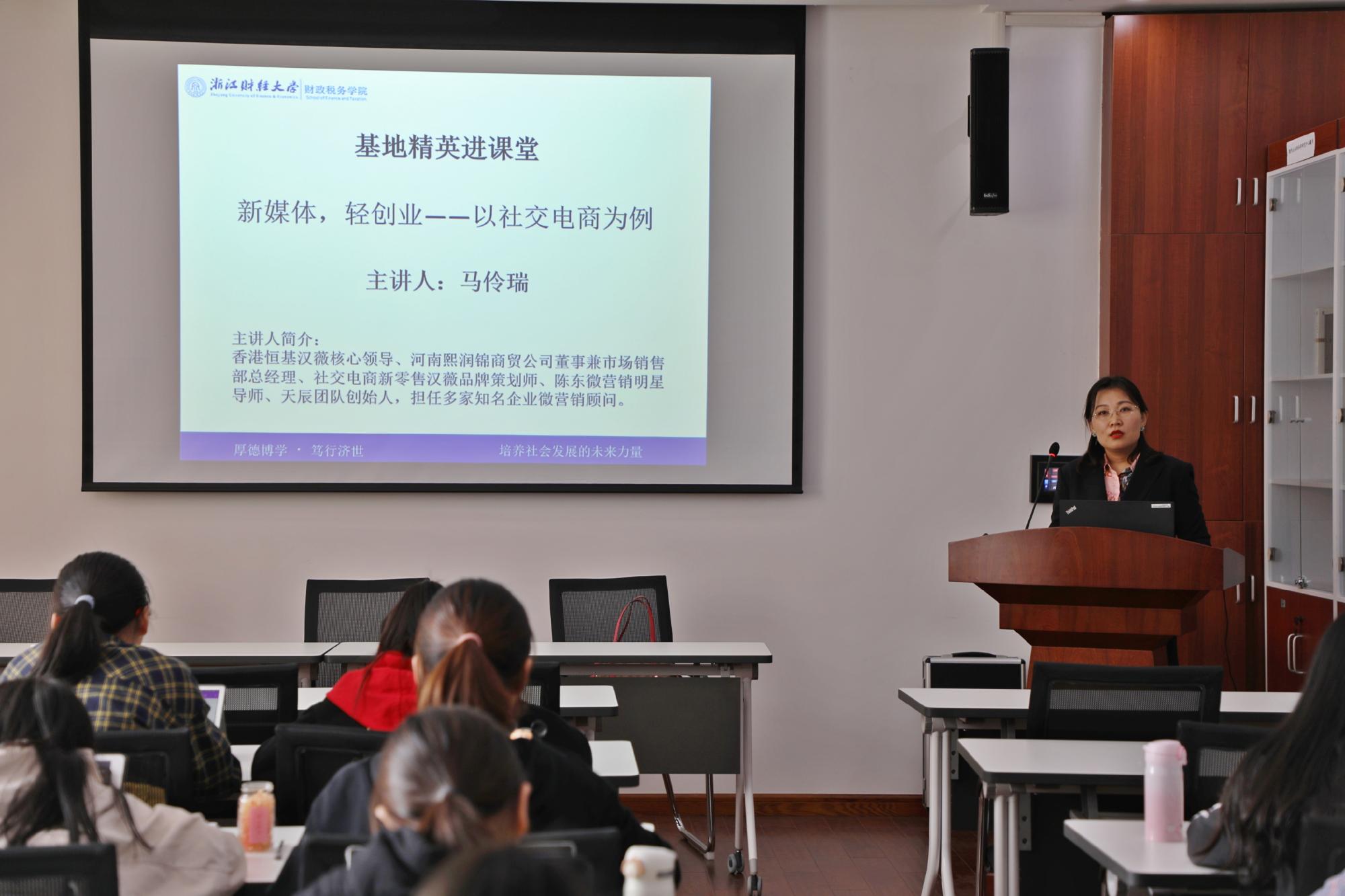 财经新闻专业“基地精英进课堂”活动在学院楼321报告厅顺利举办。香港恒基汉薇核心领导成员、熙瑞锦商贸公司董事兼总经理马伶瑞女士为同学们作了主题为“新媒体,轻创业——以社交电商为例”的讲座。