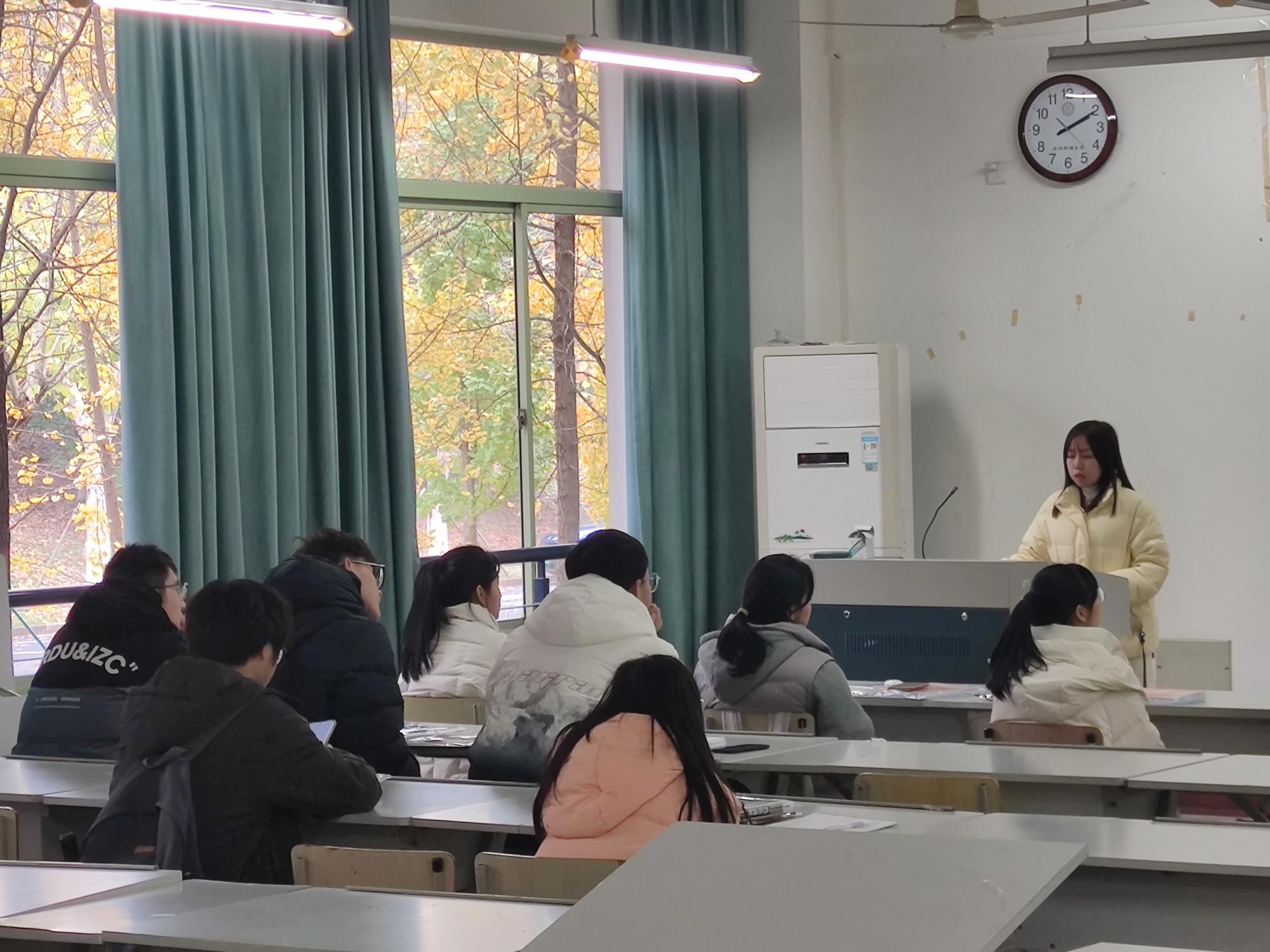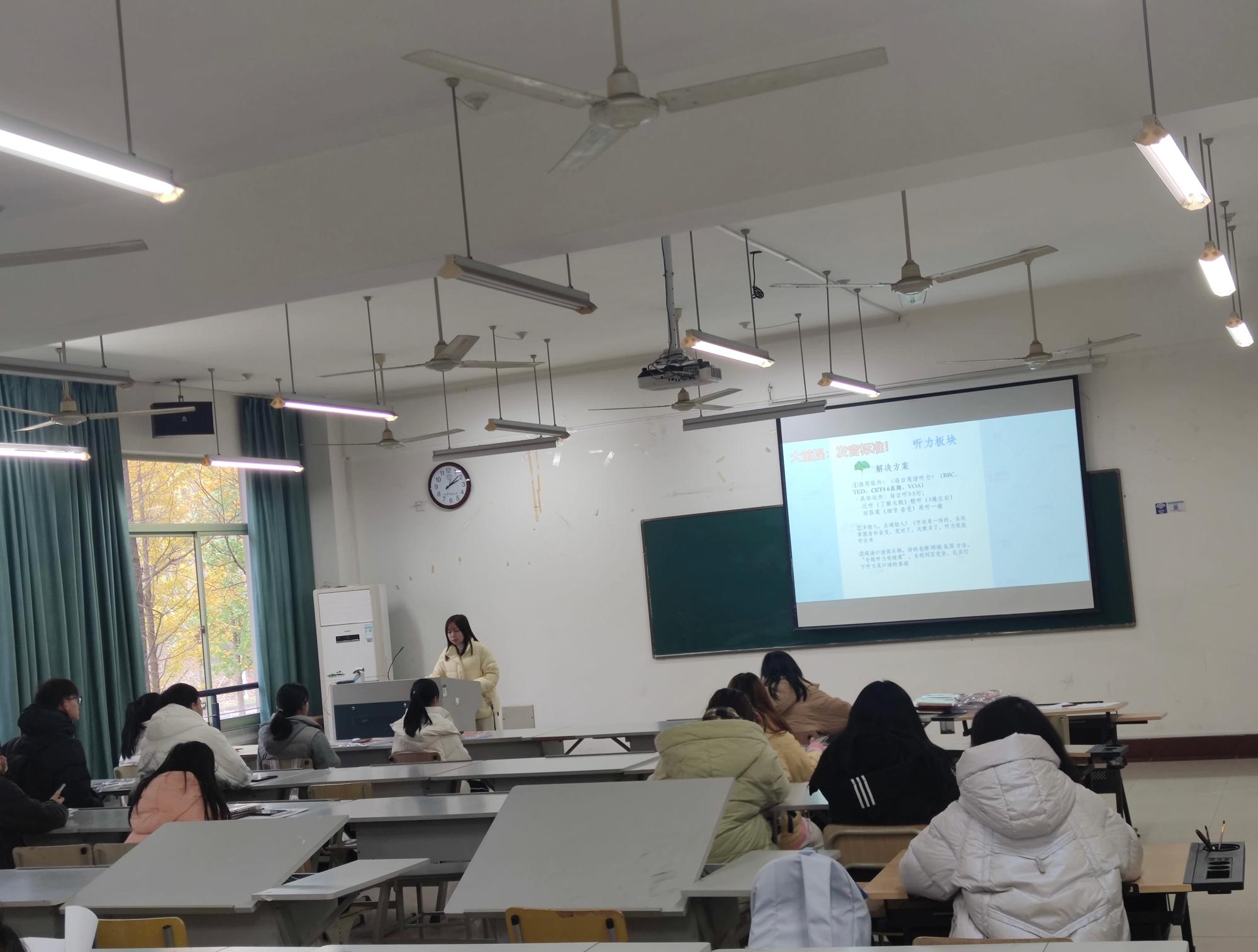 于学院楼104举行了红鹄益站之大学英语四级培训活动。2020级吴锦婷作为此次活动主讲人向大家分享英语技能提升相关经验。